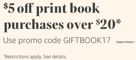 Amazon is offering up a brand new promo, of $5 off an order of $20 or more of books with code: GIFTBOOK17