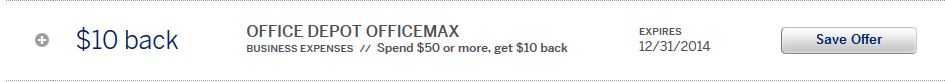 - Get a $10 statement credit with your registered American Express credit card when you spend $50 or more in-store and online at OfficeDepot / Office Max. Valid through 12/31/14.