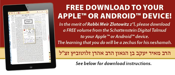 For a limited time, L’ilui Nishmas R’ Zlotowitz Z’L, Artscroll is offering a FREE digital Talmud English Volume for download to your Apple or Android device!
