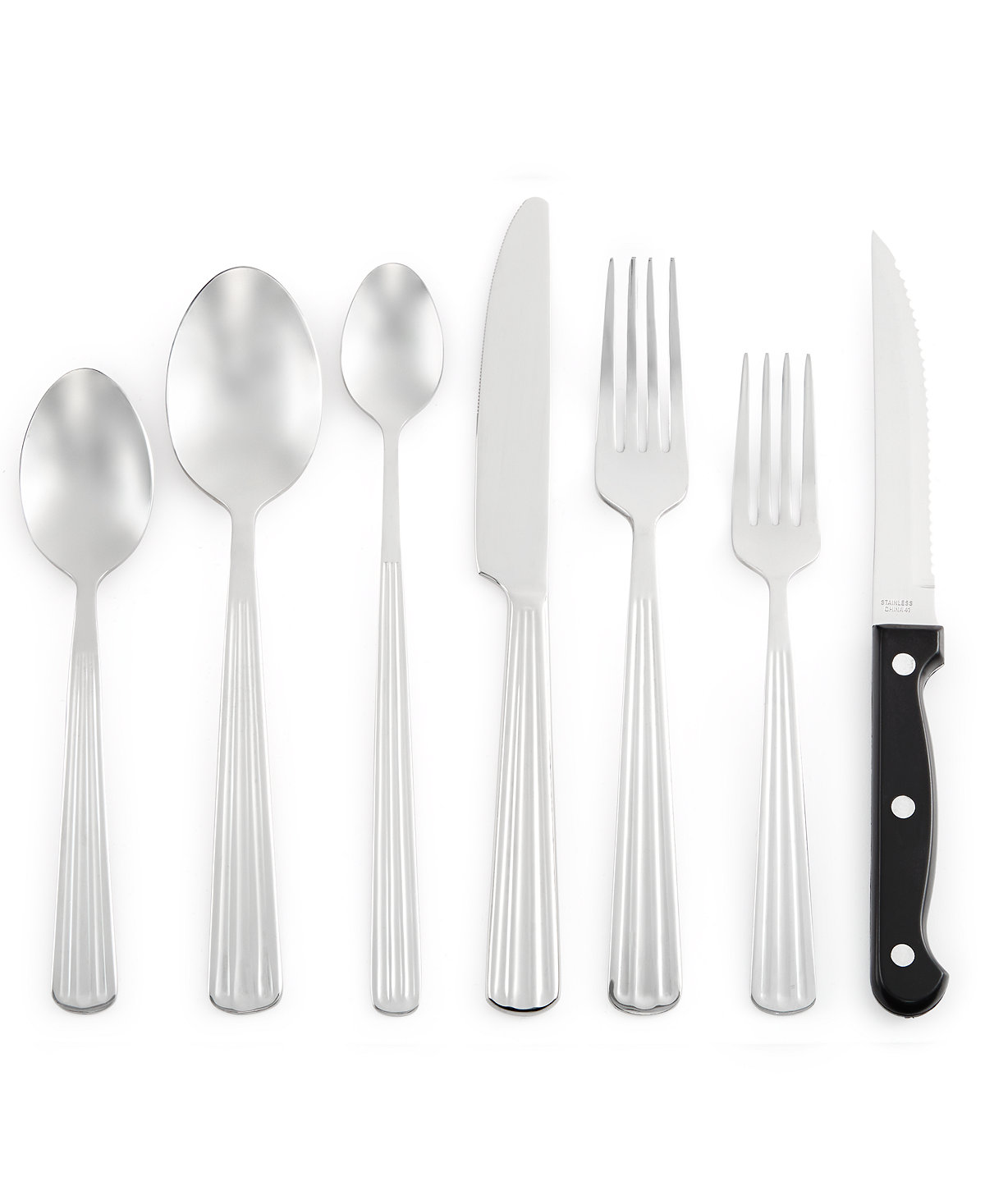 - Six each of dinner forks, salad forks, dinner spoons, teaspoons, dinner knives, steak knives and iced tea spoons
