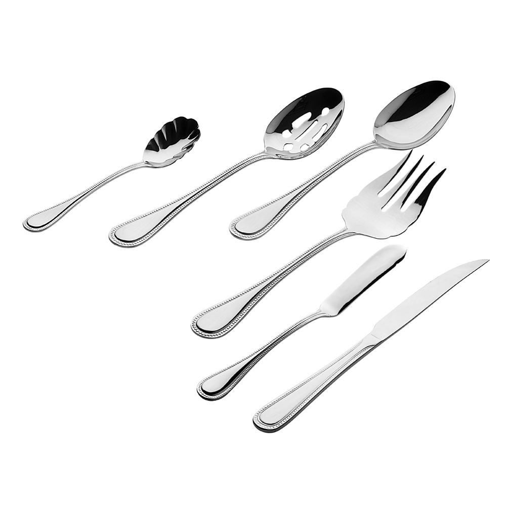 - 77-Piece set includes 6 of each, dinner knife, steak knife, salad spoon, teaspoon, salad fork and dinner forks plus a hostess set