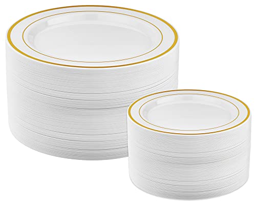 - Elegant Gold Dinner and Salad Plates: Add a touch of elegance and refinement to your next party or dinner function. This crisp white plate set with a beautiful gold trim will add a luxurious look to your table. This set of plastic plates includes two sizes, ensuring you have the perfect sized Dinner, Dessert, Cake, Cocktail or Appetizer plate!