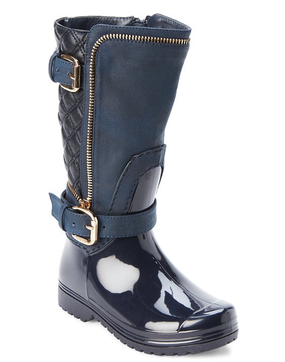- Waterproof rubber upper, round toe, faux leather shaft with diamond-quilt and zipper detailing, double buckle design