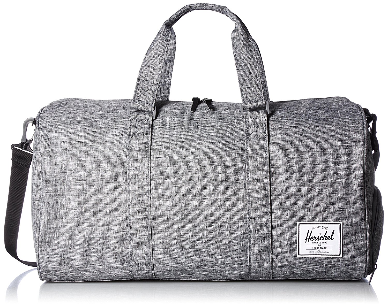- Duffle bag featuring top handles with wrap-around bands and logo patch at bottom corner