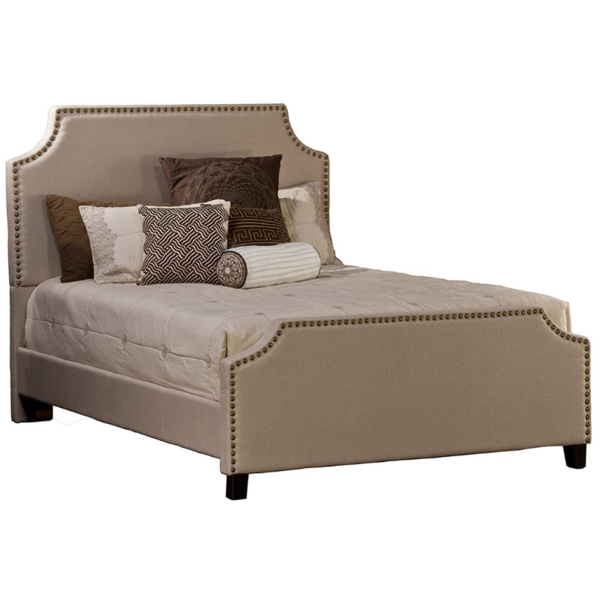 - Upholstered King bed Set in Linen Stone fabric with decorative nail head Detailing