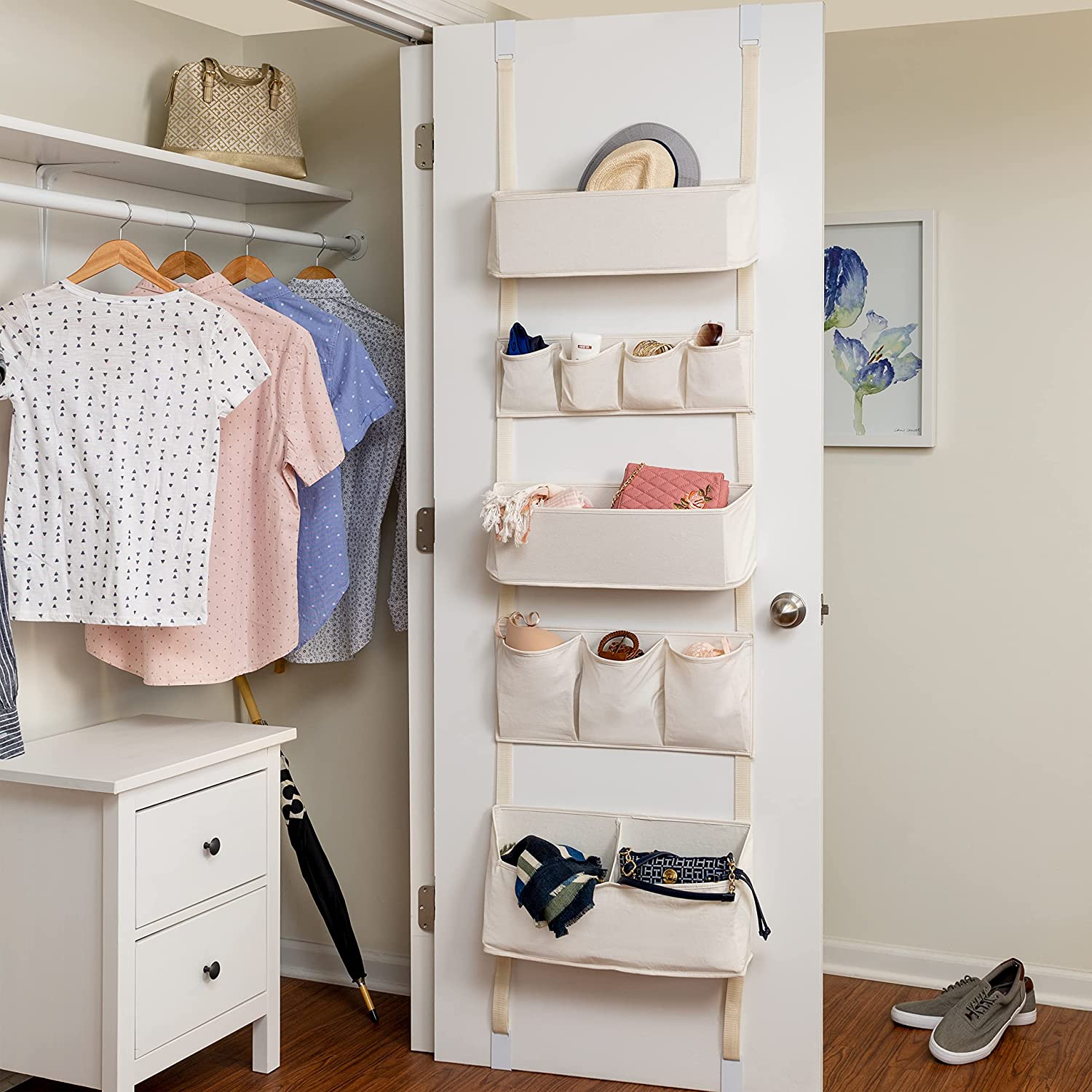 - Hangs over the door for simple storage and easy access