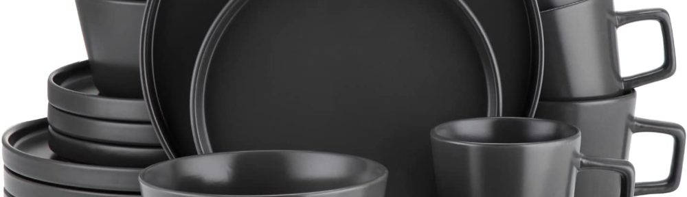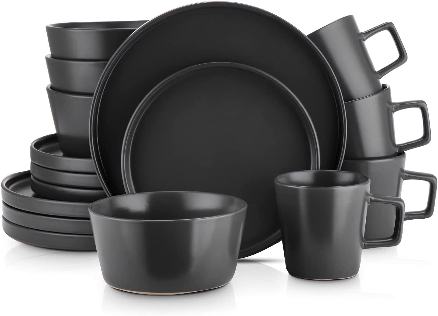 - 16 Piece dinnerware set – stoneware is hip, cool and trendy. Especially in a fashionable Black Matte. These sets of dishes make a statement.