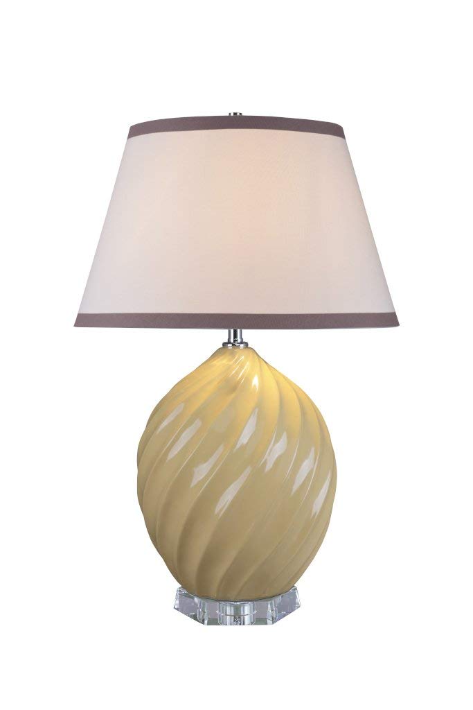 - Daffodil Yellow finish with crystal base | Lampshade color & type – White with trim on top and bottom, Faux Brussel Fabric, Empire shaped lamp shade