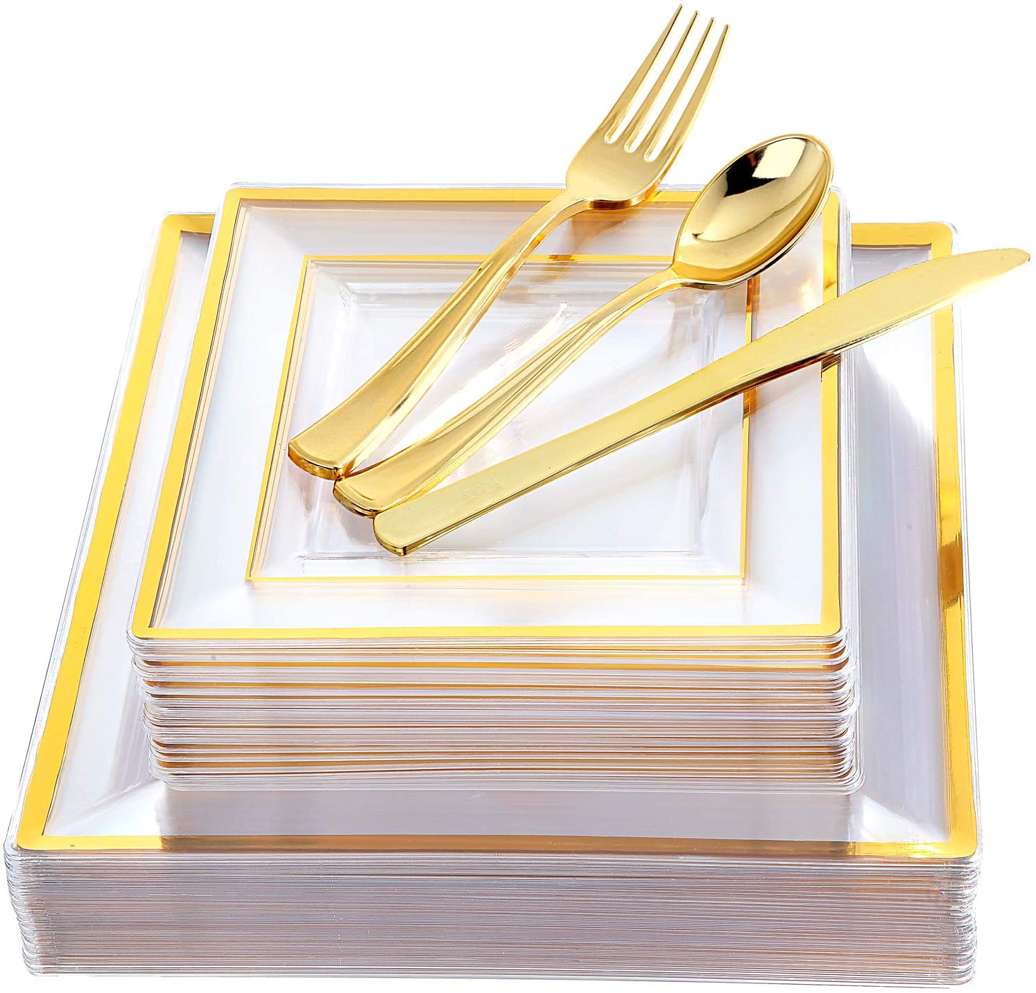IOOOOO 120 Pieces Clear Gold Plastic Square Plates With Disposable Silverware – Link