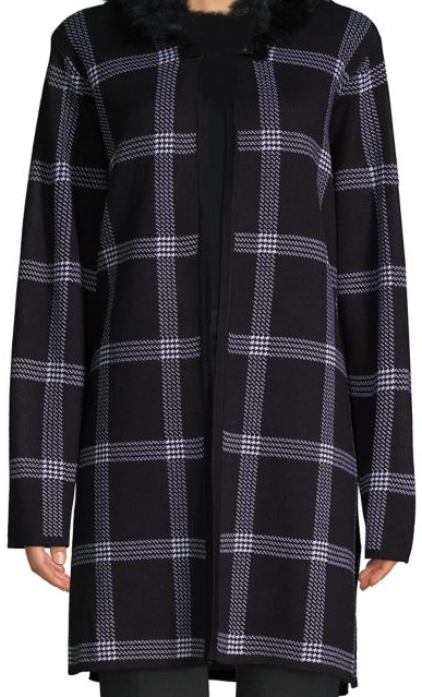 - Stylish faux fur-trimmed hooded coat with a windowpane houndstooth design.