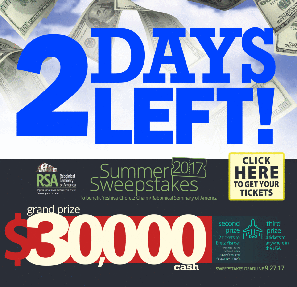 Yeshiva Chofetz Chaim’s raffle will be in just 2 days. Get your tickets now!