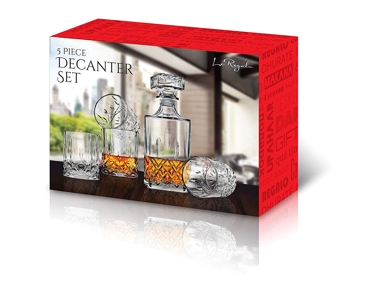 - This elegant 5pc decanter set deserves a place of pride on your bar, in your hand or at your lips.