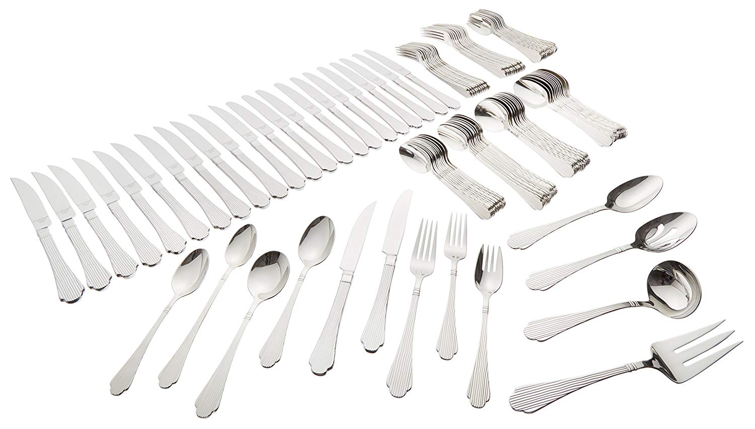 - 12 place knives, 12 place forks, 12 place spoons, 12 salad forks, 12 teaspoons, 12 steak knives, 12 sporks, 12 iced beverage spoons, 12 round bowl spoon spoons, serving fork, serving spoon, pierced serving spoon, gravy ladle.