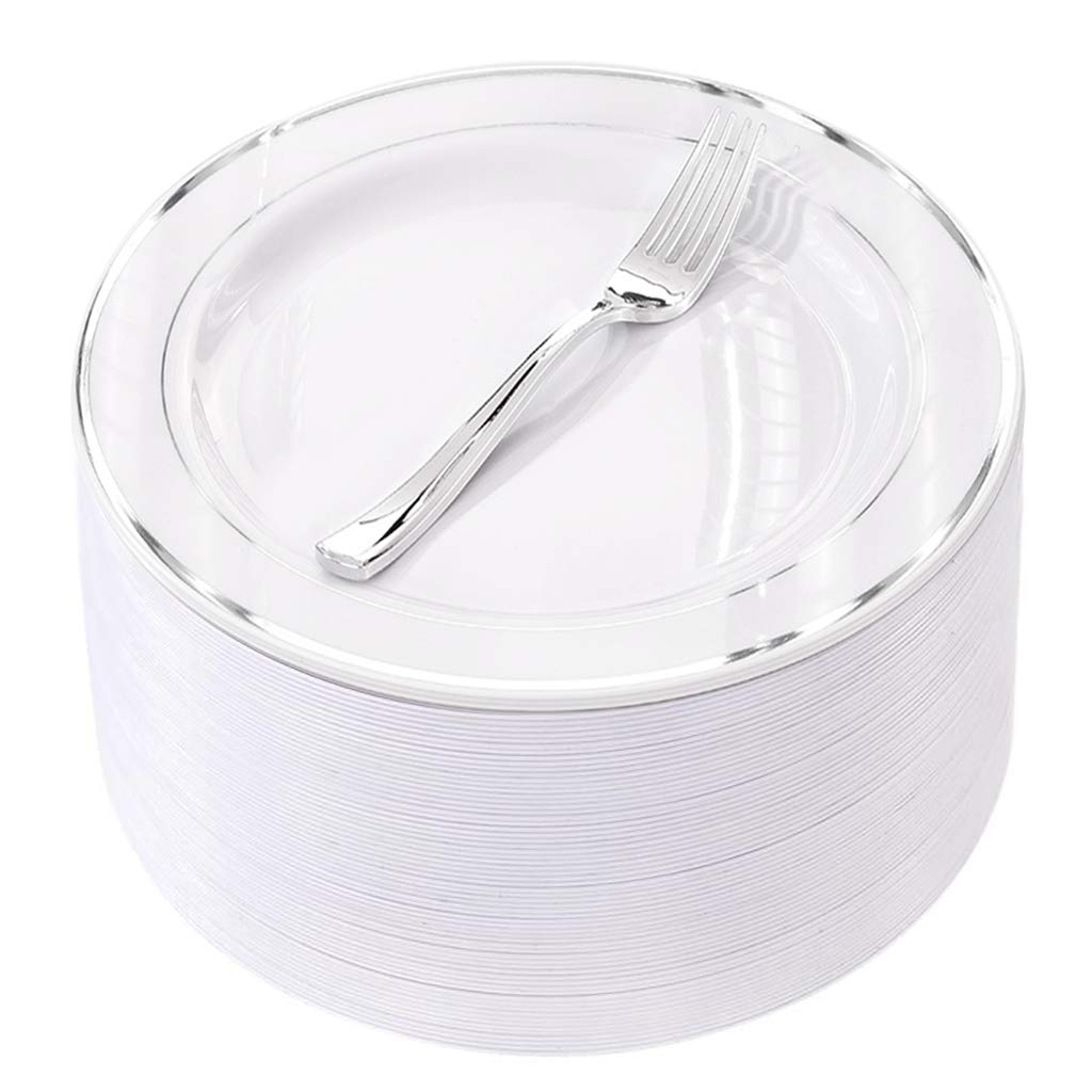 - GREAT VALUE:The plastic dinner plates are enough for you to hold any heavyweight food,also could feel quality by the weight of it in your hand.Also silver forks are very sturdy and recyclable.The matching of them is perfect,which is unique in AMAZON.Wow!!!