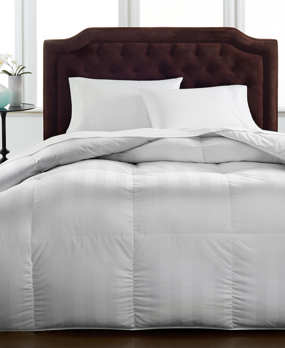 “Look forward to bedtime with a billowy down comforter our Hotel Collection, crafted with baffle-box construction to keep down right where it belongs. Limited 10-year warranty.”