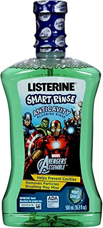 - 500-milliliters of Listerine Smart Rinse alcohol-free mouthwash for kids featuring Marvel Avengers packaging to protect teeth against cavities when used as part of a regular oral care routine