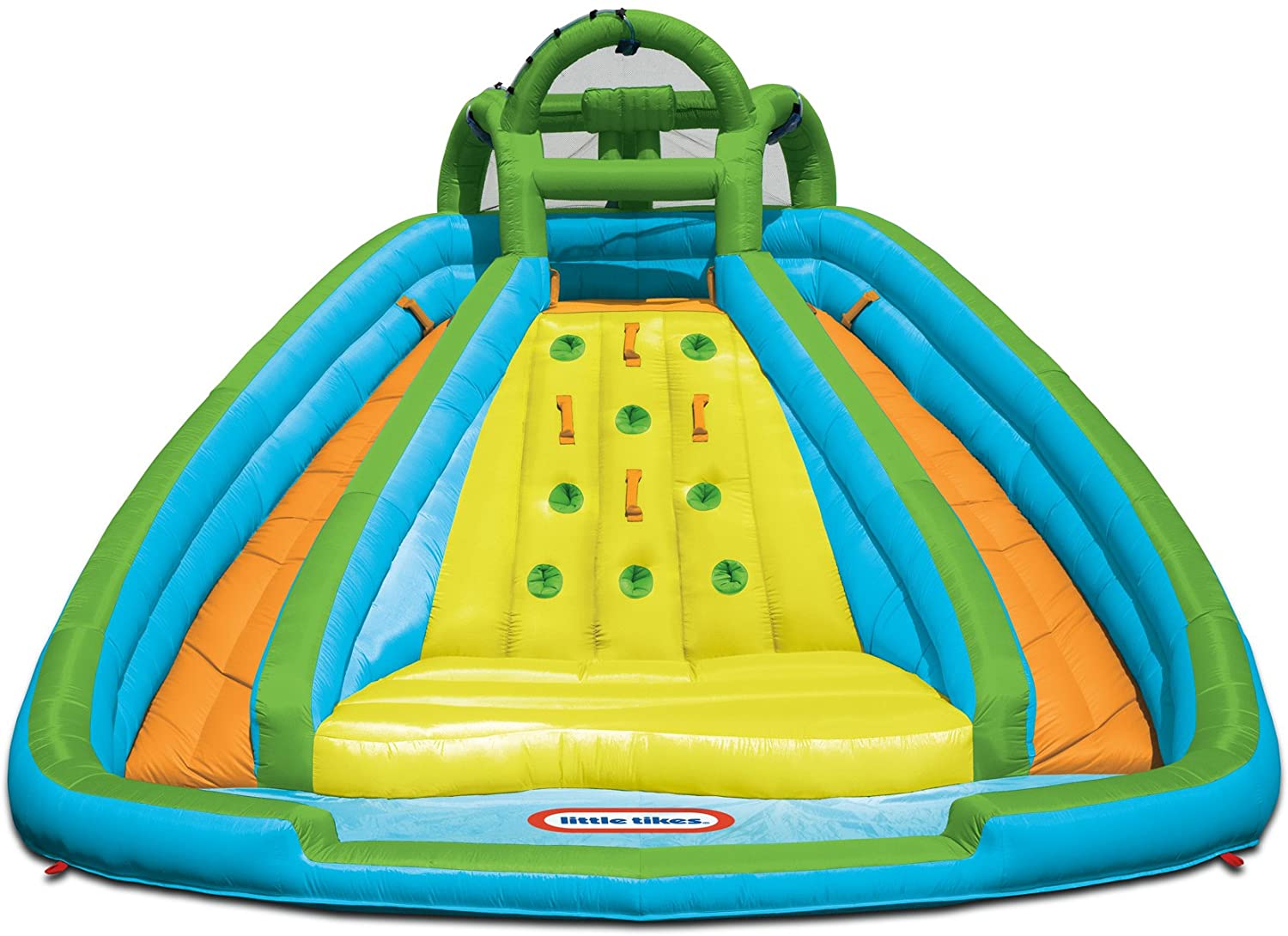 - A surprise dump bucket pours water on kids climbing up the center inflatable rock wall
