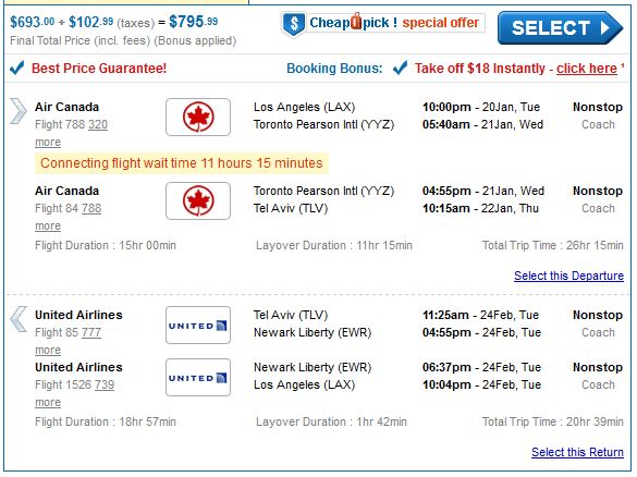 You can currently purchase round-trip tickets from Los Angeles California to Tel Aviv Israel for just $785 roundtrip! This fare is valid for United Airlines and/or Air Canada! With Air Canada, there is a stop in Toronto, with United, you’ll have a stop in Newark NJ.