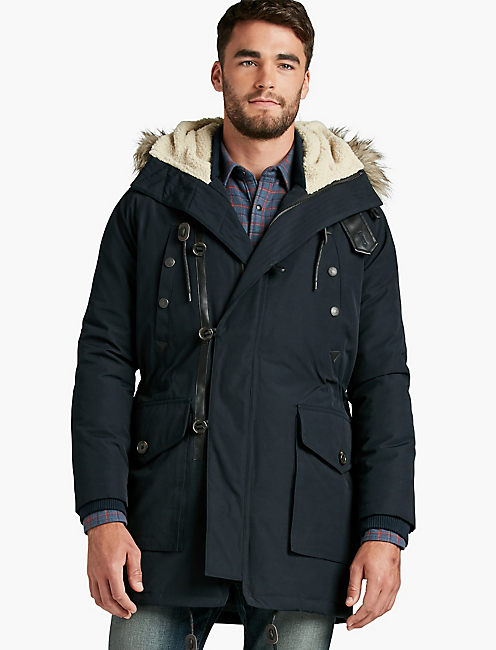 “Protect yourself from the harshest of winter elements with our weather-resistant parka. It features a faux fur lined hood, storm cuffs, down lining, leather-trimmed chest pockets and two large patch hip pockets.”