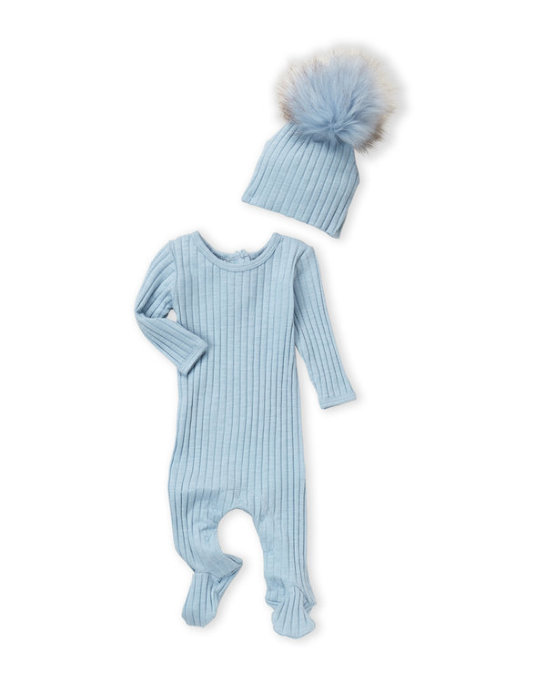- Maniere 2-Piece Ribbed Footie & Pom-Pom Hat Set – Light Blue