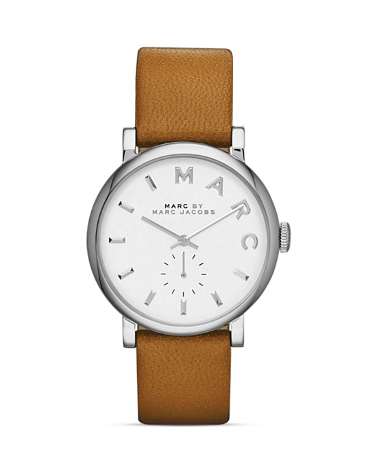 - 3-hand analog movement; silver-tone markers with “MARC” at 12, 1, 2 and 3; textured leather strap