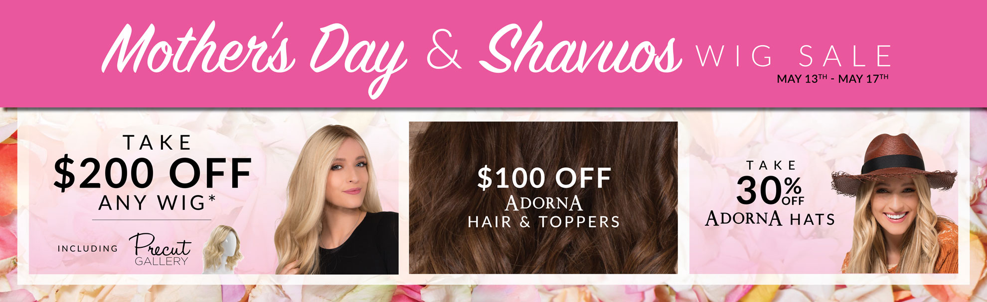 Milano Collection Wigs is having a Mothers Day / Shavuos sale, and is offering $200 off any Milano wig, $100 off any Adorna hair, toppers and hat falls, and 30% off Adorna hats.