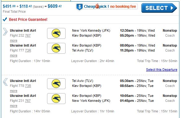 These fares are available for most dates now through the end of February of next year with a small scattering also in March. Tickets are bookable on CheapOAir. Flights are on Ukraine International airlines, with a stop-over in Kiev.