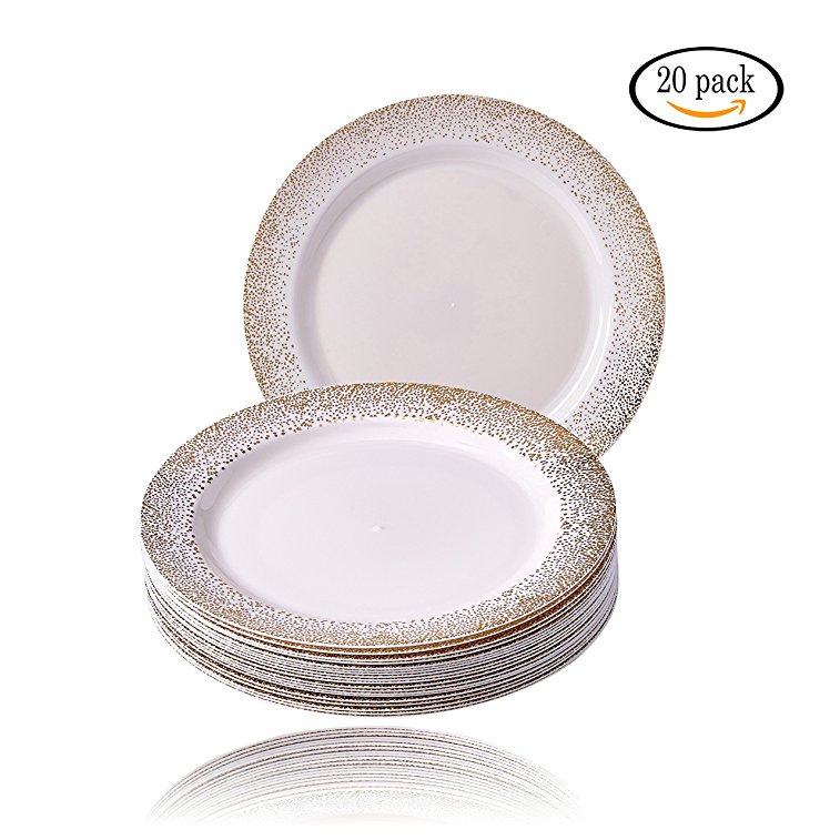 - Elegant Fine China-look Disposable Round White with Gold Mist Border Dinnerware Plates – Heavyweight Plastic 7.5 Inches Side Plates