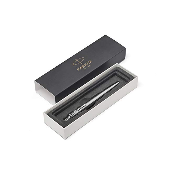 Parker Jotter Ballpoint Pen, Stainless Steel with Chrome Trim, Medium Point Blue Ink, Gift Box – Link