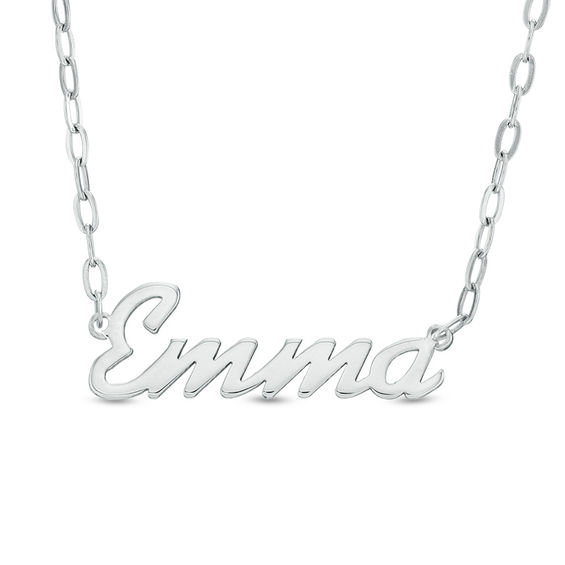 “Fashioned in sleek stainless steel, a name or phrase, up to 12 characters maximum, is sculpted in a trendy and stylish script font. Polished to a brilliant shine, this Personalized style suspends along a 20.0-inch rolo chain, with additional closures at 16.0 and 18.0-inches, that secures with a lobster claw clasp.”