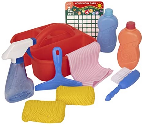 - CLEANING SET: Playkidz cleaning set contains a full range of supplies for kids that includes sponges, brush, cloth, bottles, brush, housework chart, and a caddy!
