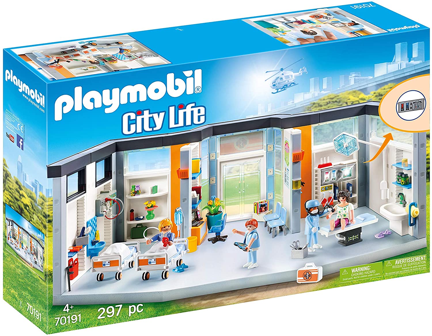 - Set includes four figures, furnished hospital wing, two rolling patient beds, exam bed, stethoscope, medical charts and tools, laptops, magazines, test tubes, microscope, bandage stickers, and many other accessories