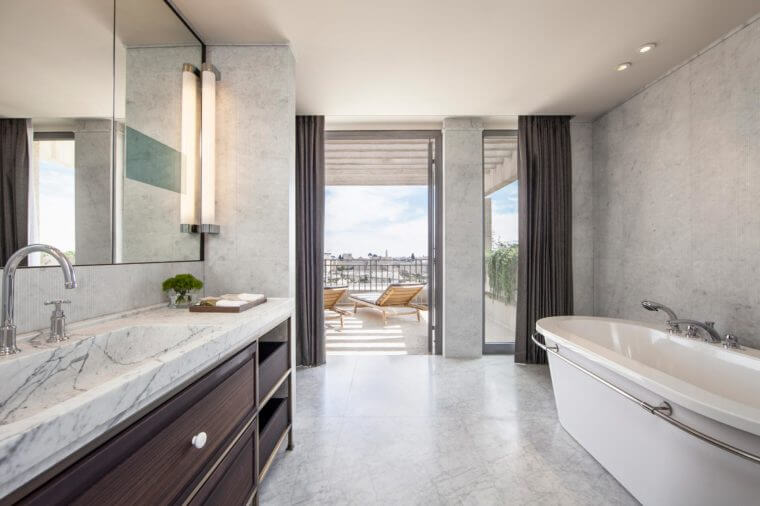 “Renovated in 2016 by Italian designer Piero Lissoni, the Presidential Suite at The David Citadel Hotel offers modern elegance in historic Jerusalem. Oak parquet flooring connects the bedroom, living room, dining area, and study area of the 958 square-foot suite with a furnished balcony running the entire length of the space. Before you explore the local sights, including the Old City, the Western Wall, Tower of David, and the colorful Machane Yehuda market, grab a few complimentary bottles of mineral water and enjoy the delicacies of a full Israeli buffet breakfast”