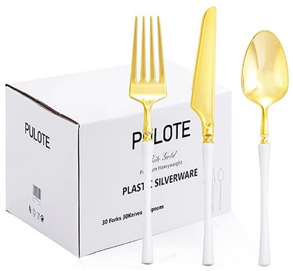 PULOTE 90 PCS Gold Plastic Silverware & Gold Cutlery with White Handle- Link