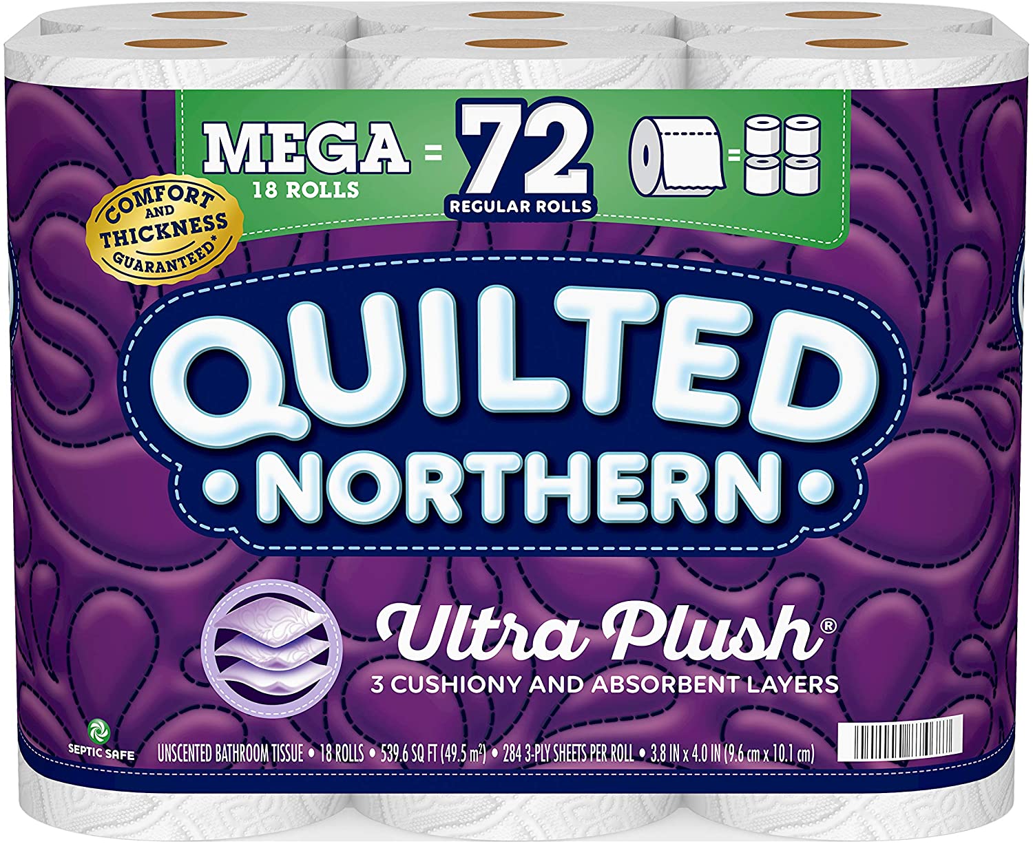 - Each pack contains 18 Mega Rolls of Quilted Northern Ultra Plush toilet paper