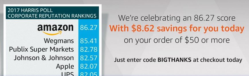 Today only, to celebrate their #1 Corporate Reputation Ranking in the 2017 Harris Poll, Amazon is offering up a rare coupon for $8.63 off your Amazon order of $50 or more!