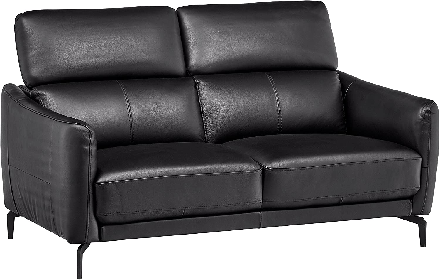 - This leather loveseat isn’t just handsomely styled; it’s cleverly functional, too. A headrest across the back adjusts upright for watching TV, then tilts back when you’re ready to relax. Compactly sized for smaller spaces, it features modern metal legs.