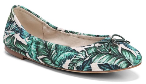 - Colorful slip-on ballet flats in rich wallpaper palm print with small bow detail at toe