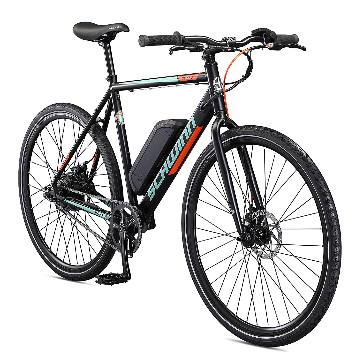 Schwinn Monroe Single-Speed Electric Bike, 250 Watt Hub Drive Motor with Handlebar LED Display, Mechanical Disc Brakes, and 700c/27.5-Inch Wheels – Link