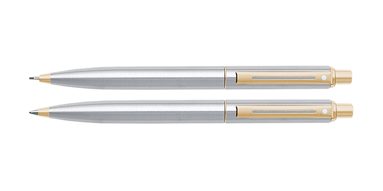 “A simple click of a button and…you’re ready to write… The Sheaffer® Sentinel® features a convenient push-button mechanism that allows you to activate the tip of the pen instantly. The Sentinel® fits into virtually any portfolio or pocket calendar, making it perfect for practical everyday use. Its classic slim profile allows for a pleasurable writing experience, whether you choose the ballpoint or pencil.”