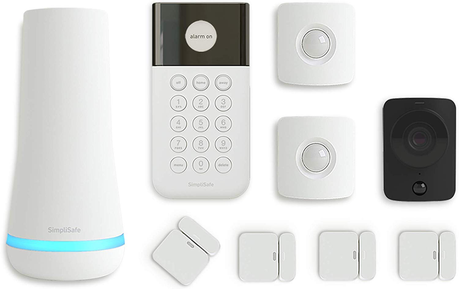 - Includes: Base Station with built-in 95dB siren, 4 Entry sensors, 2 Motion sensors, SimpliCam, Yard sign, Window security stickers and a Free month of monitoring