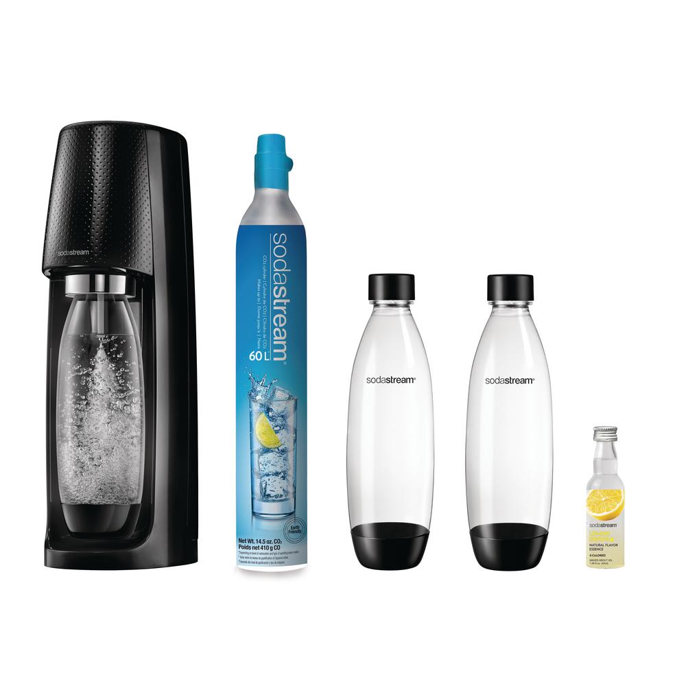- Kit includes black fizzi sparkling water maker with 14.5 oz. compressed CO2 cylinder, three 1l carbonating bottles and lemon fruit drops
