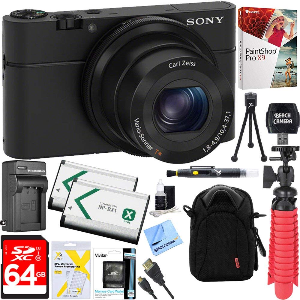 - BUNDLE INCLUDES: Kodak Pro Camera Case for Digital Cameras (Black) – 64GB Class 10 UHS-1 SDXC Memory Card – 2 x NP-BX1 Extra Battery Pack and Charger – Corel PaintShop Pro X9 Digital Download – 12-inch Rubberized Spider Tripod – LCD/Lens Cleaning Pen – SD Memory Card Reader – Tri-fold Memory Card Wallet – LCD Screen Protectors – Mini Tabletop Tripod – 3 Piece Lens Cleaning Kit – Beach Camera Microfiber Cleaning Cloth