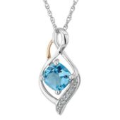 “This sterling silver and 10k yellow gold pendant features a cushion cut Swiss blue topaz gemstone with created white sapphire accents.