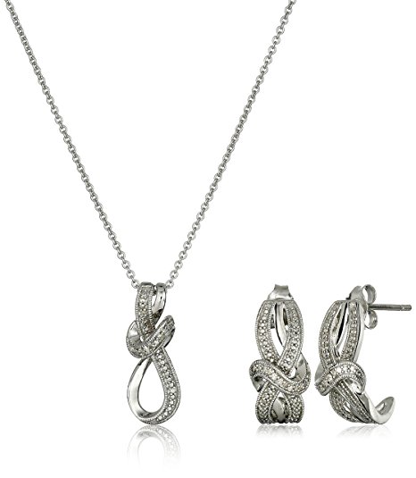 - Two-piece sterling silver swirling knot pendant necklace and earrings set each featuring small pave-set diamonds