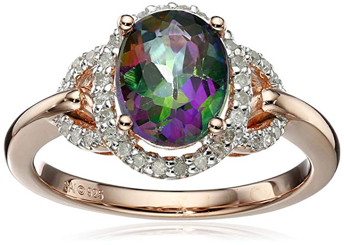 - Pink gold-plated sterling silver ring with oval-shaped mystic fire topaz center stone surrounded by a halo of created white sapphires