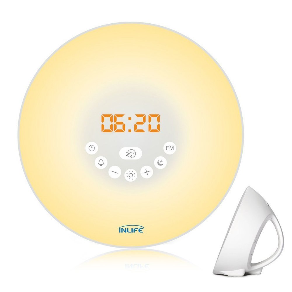 - Sunrise simulation alarm clock with snooze function: the wake up white light will gradually brighten from 10% to 100% brightness over 30 minutes to bring you gently out of a deep sleep. With Snooze function, giving you an extra 5 minutes of sleep when touch Snooze button