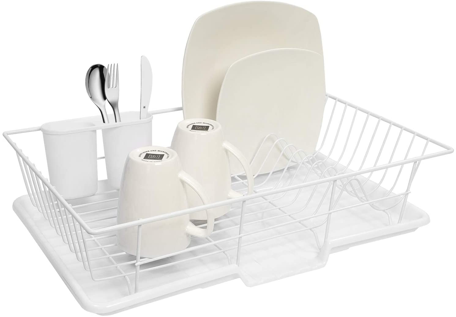 - Set includes one dish rack, one plastic cutlery caddie, and one drain board