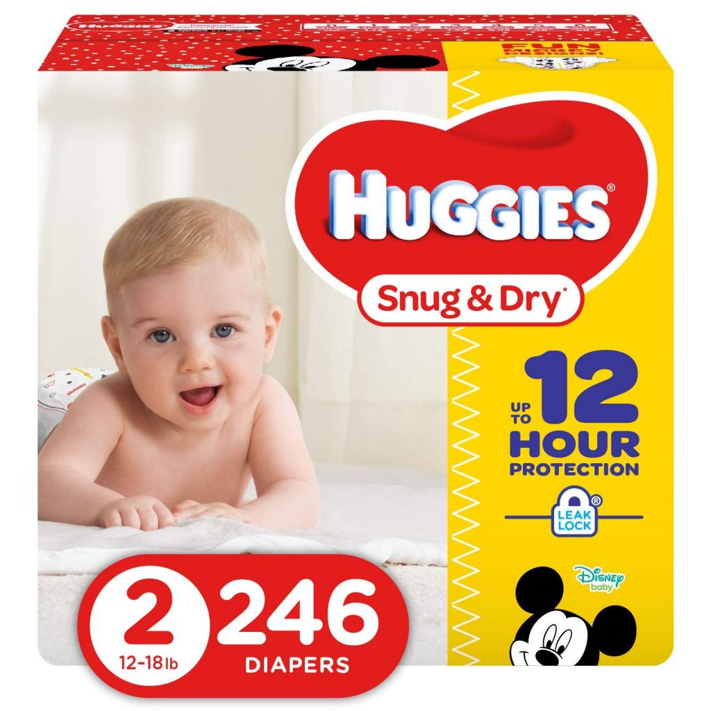 - Huggies Snug and Dry Diapers, Size 2, 246 count: $24.69-$30.39 (10¢-12.3¢ ea.)