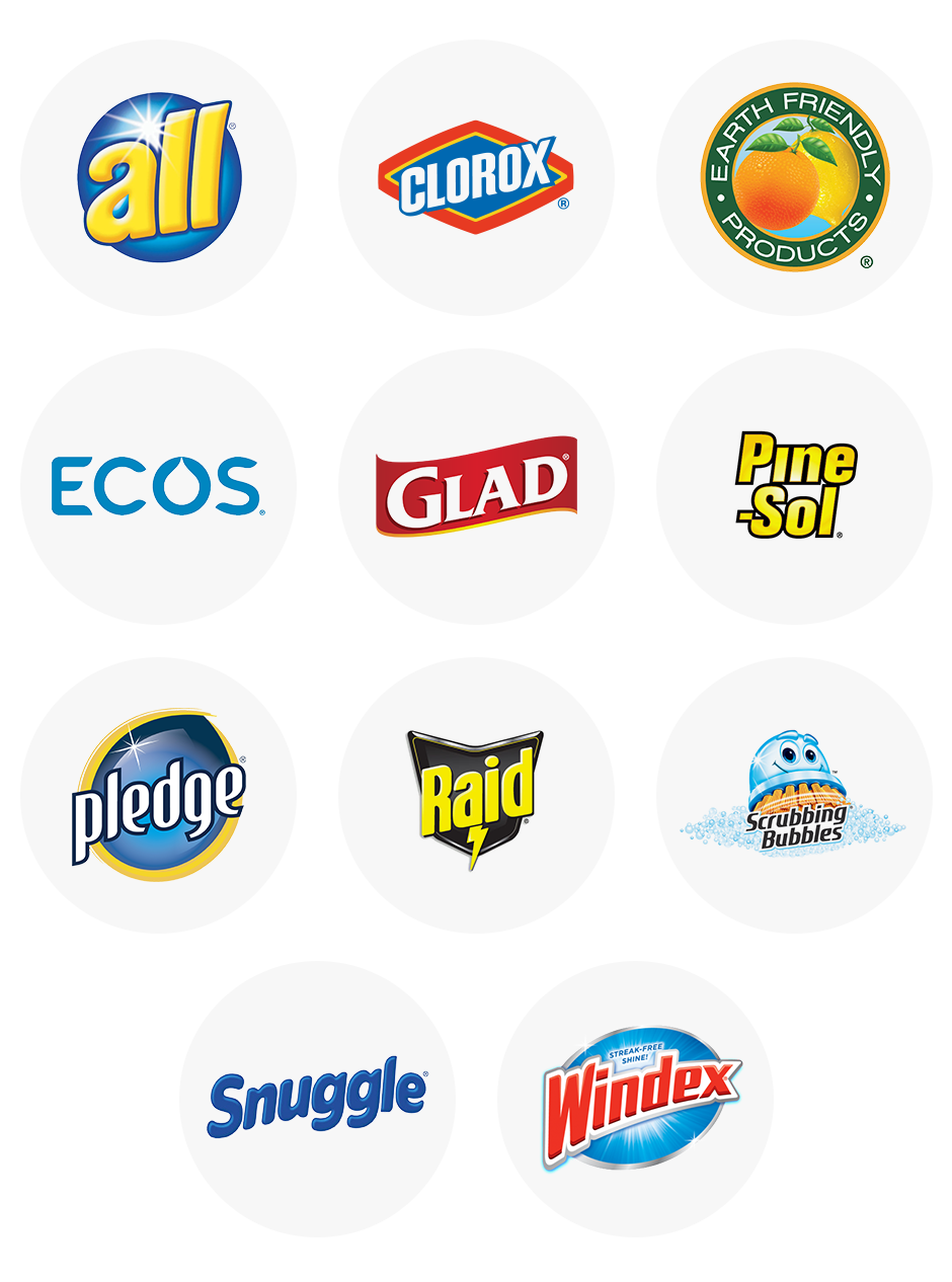 Brands include All, Clorox, Febreeze, Finish, Glad, Method, Persil, Pine-Sol, Pledge, Purex, Raid, Renuzit, Scotch-Brite, Scrubbing Bubbles, Snuggles, Soft Scrub, Tide, Windex and more.